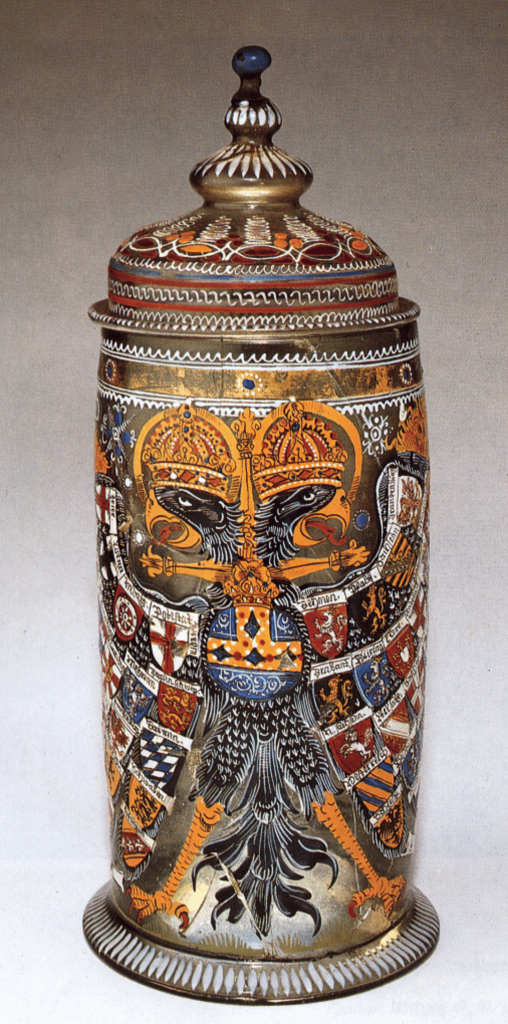 Dieser große Humpen heißt Reichsadlerhumpen. Er ist 31 Zentimeter hoch und hat ein Fassungsvermögen von fast 4 Litern. Vom 16. bis zum 18. Jahrhundert war er einer der beliebtesten Trinkgefäße. Weltliche und geistliche Würdenträger wie Kaiser, Kurfürsten und Päpste nutzten den riesigen Glaskörper, um dem Volk in bildhafter Form den Aufbau des Reiches zu erklären.