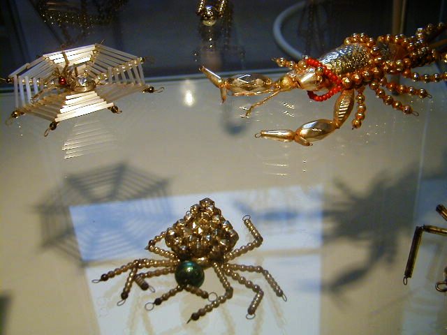 Spiders were a popular Christmas motif in the northern Bohemian town of Gablonz or Jablonec in today's Czech Rebublic. And glass Christmas tree decorations have been produced there since 1860. Everything that touched and moved the human being was reproduced in the imaginative figures, miniature versions of everyday objects. This very individual style of Christmas tree decoration developed from the button and pearl industry and the flourishing fashion jewellery industry. Gablonz Jewellery was known in almost every part of the world and was an important export for the royal monarchy.