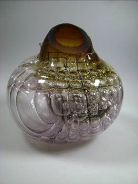 Jörg F. Zimmermann, born in 1940 in Uhingen near Göppingen, is a glasscutter, glass painter, designer and a visual artist. He has been teaching at the visual arts Academy in Stuttgart using the only glass furnace used for academic purposes in the state of Baden-Württemberg, since 1983. Zimmermann’s mesh or honeycomb objects enjoy world fame and we have had some of these in our studio glass collection for a long time.