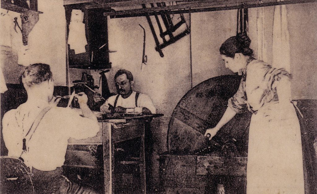 From the mid 19th century onwards, gossamer glass threads were drawn from glass rods in Lauscha in the Thuringian Forest. The spinning machine used to produce them was called an „Angel’s Hair Machine.“ Smooth glass threads were used for bird’s tails, rosettes and angel’s wings, while curly glass threads were used as angel’s hair for traditional gold-coloured Christmas tree fairies and other Christmas tree decorations.